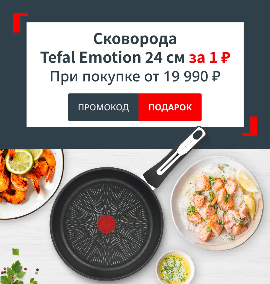 *Предложение не суммируется с баллами программы лояльности, с другими акциями и промокодами. При возврате товара подарочный товар так же возвращается. Акция действительна, пока сковорода Tefal Emotion 24 см E3000404 есть в наличии.