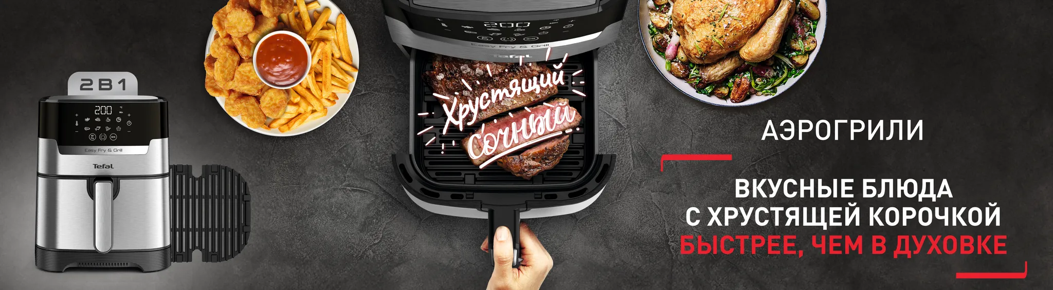 Наиболее современный и функциональный прибор на сегодняшний день — аэрогриль. Устройство создаёт поток горячего воздуха, равномерно прогревающего ингредиенты, что даёт возможность получать сочные блюда с малым содержанием масла либо вовсе без него. Мы рекомендуем обратить внимание на новинку: Tefal EY5528E0. Это тихий аэрогриль с чашей объёмом 5 литров, которую после готовки можно разместить в холодильнике, ведь ручка у чаши съёмная. А функция Extra Crisp обеспечит ещё более хрустящие результаты приготовления. Хотите прибор с большим объёмом? Тогда вам идеально подойдет Tefal Dual Easy Fry & Grill 8,3 л EY905D10 — аэрогриль с двумя чашами общим объемом 8,3 литра. Эта модель позволит вам приготовить сразу 2 блюда одновременно, чем значительно сэкономит время.